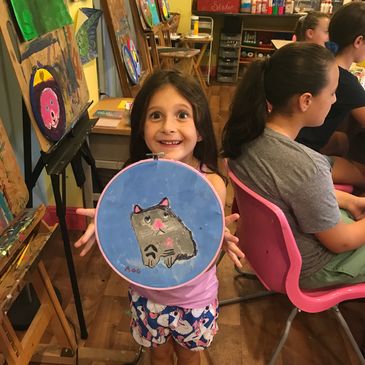 Glow In The Dark Galleries, Sun Printing, Water gun painting, Painting With Our Feet, Paper Marbelizing, Lino Cut Printmaking, Paper Mache Sculptures, Make/Paint lawn games that we have then played, we’ve dabbled in science by experimenting with acrylic pouring and cell formations creating gorgeous canvases, self-portraits, hand built plaster sculptures and more!